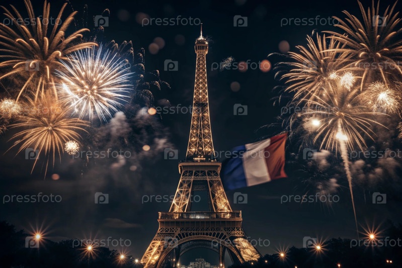 14 июля - Национальный день Франции. Государственный флаг Франции на Эйфелевой башне. Триколор. Концепция Олимпийских игр во Франции 2024