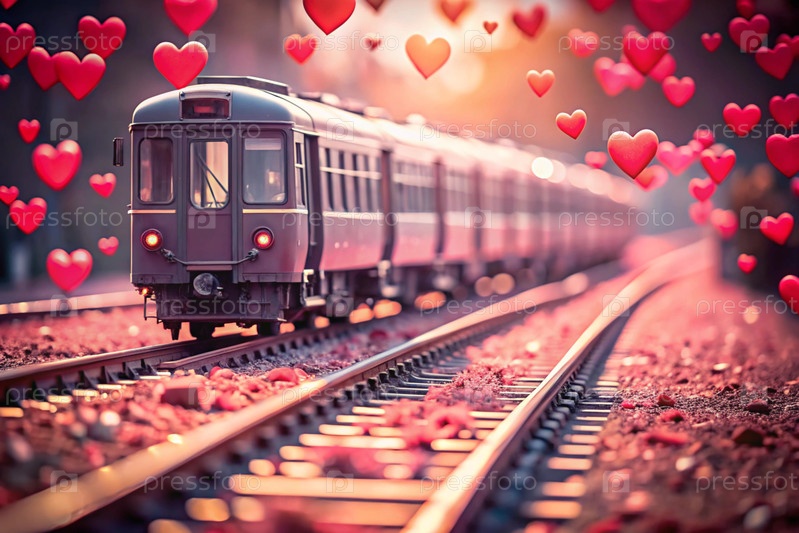 Путешествие любви. поезд и сердца вокруг. подарок для любимого человека в День святого Валентина - это как романтическое путешествие. баннер с предложениями и акциями от туроператора