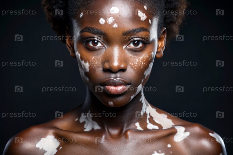 Лейкодермия. Витилиго. Плохая пигментация кожи. Большие белые пятна по всему телу и лицу. Портрет красивой девушки с кожными заболеваниями