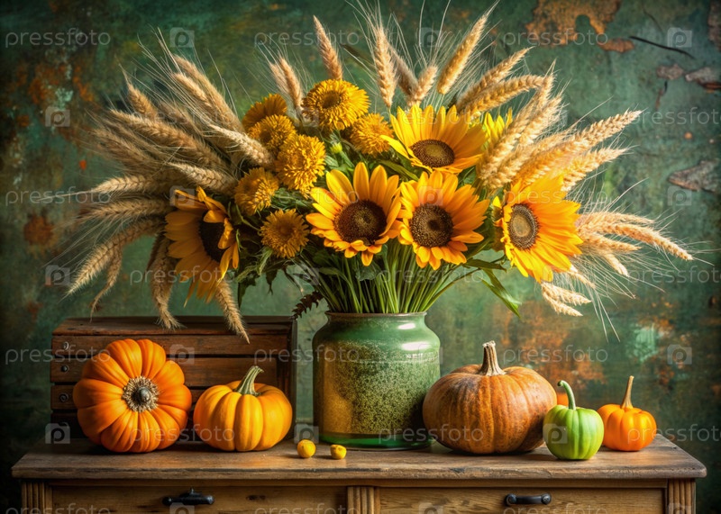 Красивый осенний букет желтых подсолнечников и пшеницы в вазе и декоративные тыквы на древнем деревянном шкафу. Букет цветов в вазе во внутренней части дома. Желтый, зеленый цветочный фон