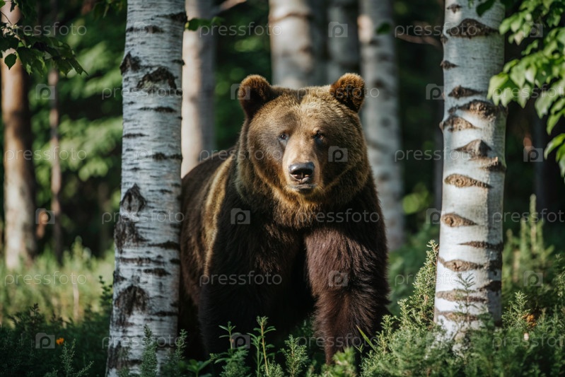 Большой коричневый медведь против березовой рощи.Охота на животных.Браконьерство