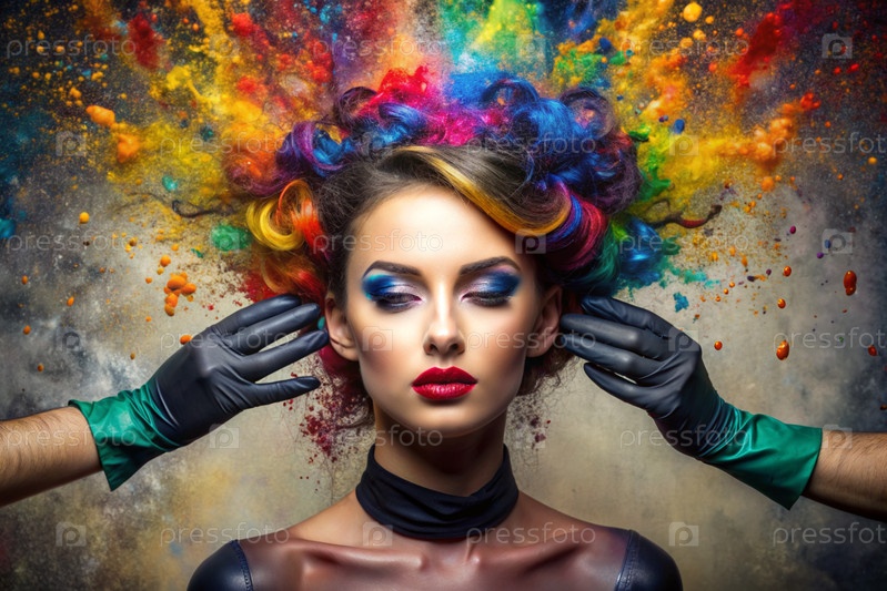 Творческий баннер для салона красоты или парикмахера. Модное профессиональное окрашивание волос. Красивая женщина с длинными многоцветными волосами. Взрыв цветов на голове