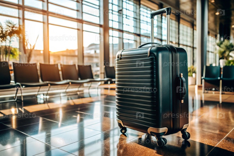 Чемодан в пустом аэропортовом салоне, сумки для путешествий в терминале вылета, концепция летнего отдыха, пространство для текста или дизайна