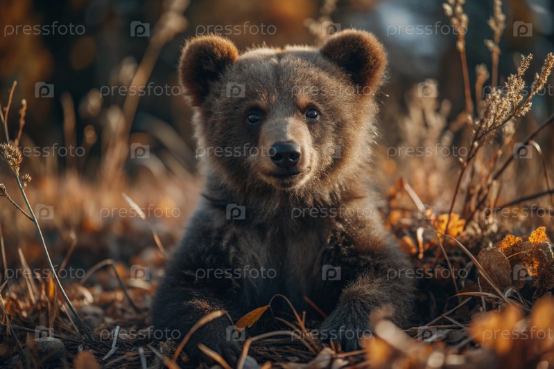 Милый медвежончик, сидящий среди осеннего желтого листья.Охота на животных.Краснобойство
