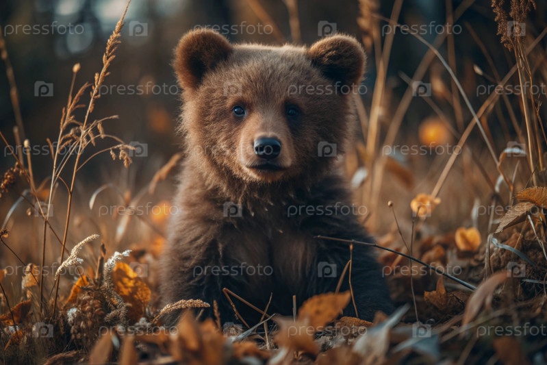 Милый медвежончик, сидящий среди осеннего желтого листья.Охота на животных.Краснобойство