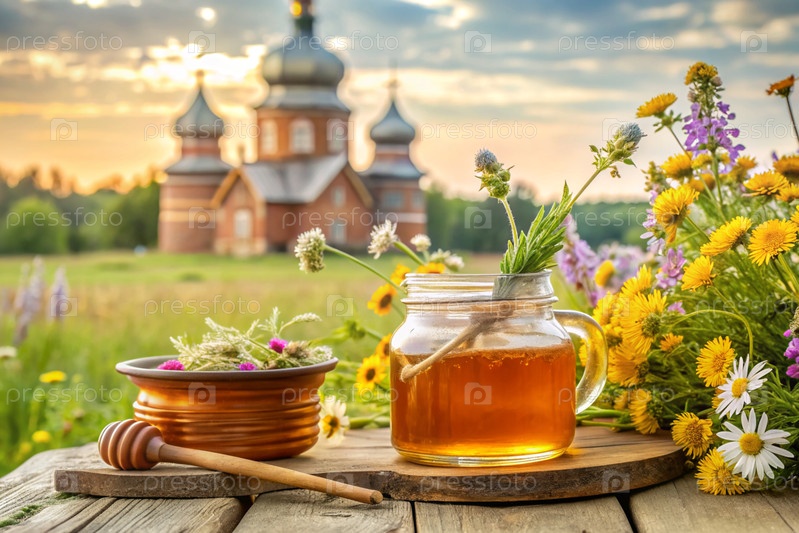 Концепция российского православного праздника 'Мёд Спаситель'.Стеклянная кружка с медом, сосны и букет диких цветов на фоне Православной церкви