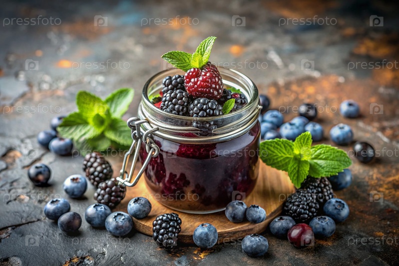 Банка домашней черники, здоровый варенье с мятой на чёрном фоне.Сохранение и уборка летом