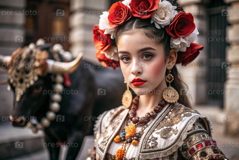 Испанская девушка в традиционном испанском национальном костюме. Перед быком. Бикоборство. Портрет символизирует традиции и культуру народа Испании