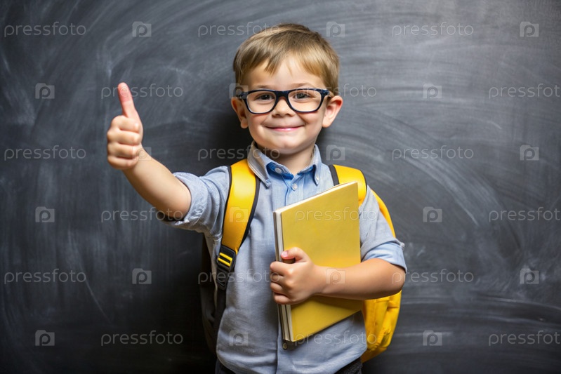 Мальчик с очками показывает класс своей рукой. Ребенок впервые идет в школу. Ребёнок со школьной сумкой и книгой. Ребёнок в классе с доской на заднем плане. Возвращение к школе