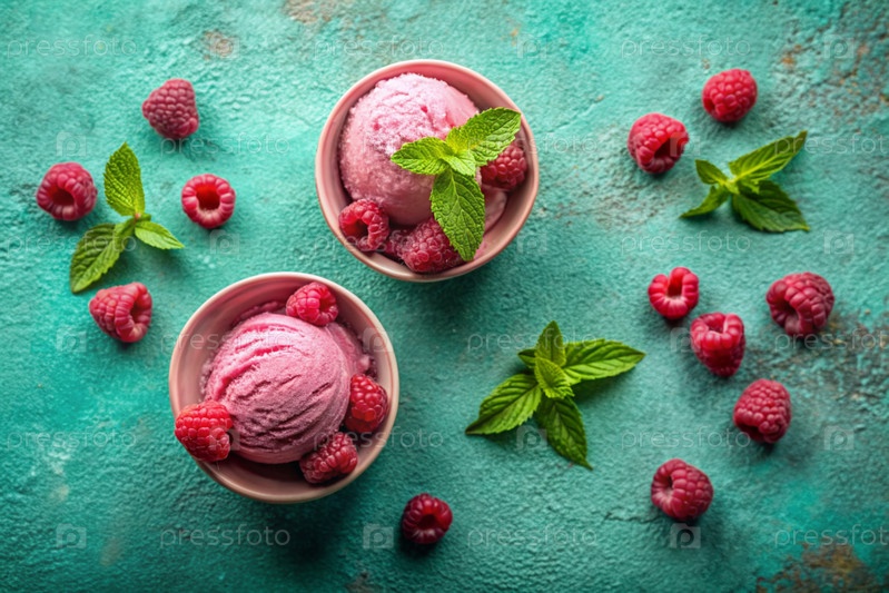 Сладкий десерт. Стильная современная концепция. Розовое малиновое мороженое на ярко-турецком фоне. Всемирный день мороженого
