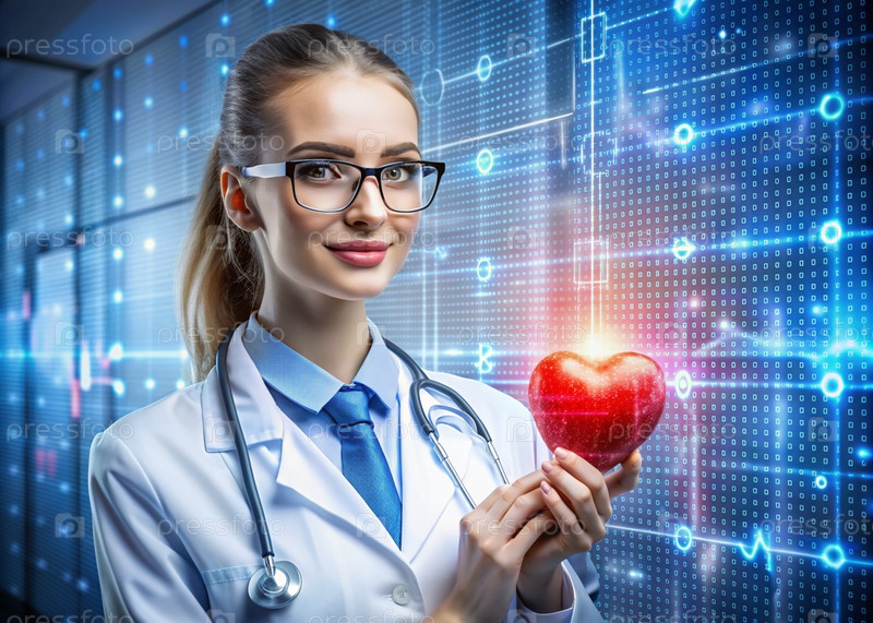 Медициной молодой красивой девушки является кардиолог с очками в кабинете со стетоскопом.Красные цифровые коды в виде частоты сердечных сокращений на виртуальном экране.Цифровые технологии будущего