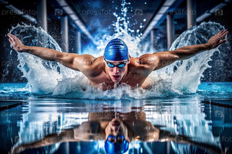 Спортивное плавание. Мужчины-плаватели. Спортсмен с очками в бассейне во время соревнований на близком расстоянии. Человек смотрит на камеру