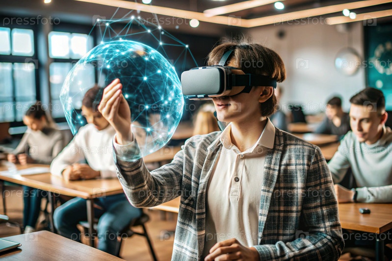 Мальчик с очками виртуальной реальности. Ребенок находится в классе, а другие ученики на заднем плане. Цифровой интерфейс отображается в наушниках