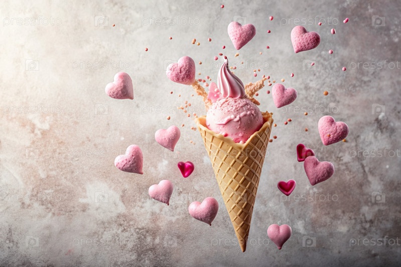Сладкий десерт. Любовь к мороженому. Сердечно-образный конус мороженого с брызгами, сердцами и пятнами. Концепция Дня святого Валентина. Баннер, реклама
