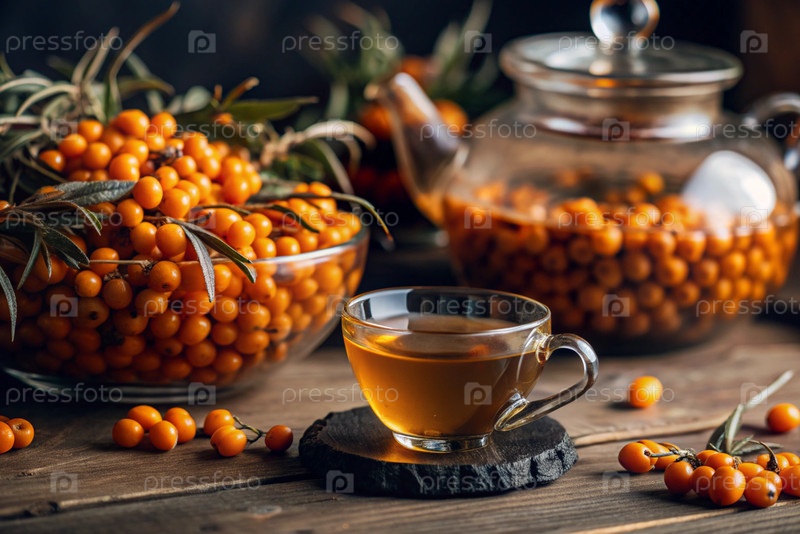 Здоровая, спелая ягода морского гречневого терна в ближайшем плане.Витамин, оранжевый, осенний, сезонный чай из ягод морского гречневого терна на темном фоне.Яблочный чай для иммунной системы
