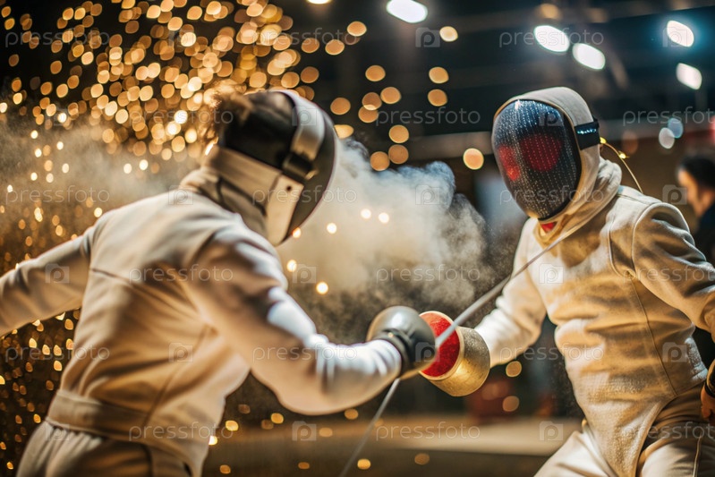 Фехтовальщики на арене с рапирами в руках во время тренировок дерутся в дуэли. Спортивное фехтование. Фехтование является типом летних Олимпийских игр