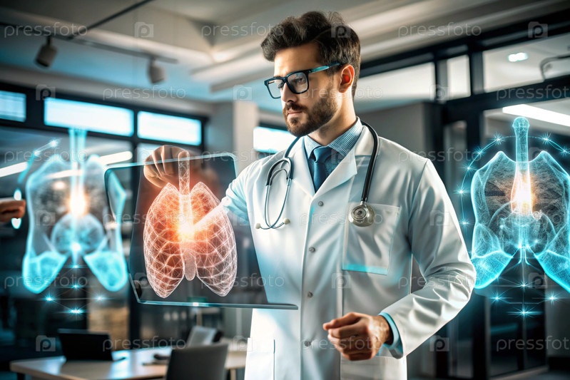 Врач в белом пальто демонстрирует голографическую модель человеческого легкого.Развитие медицинских технологий с использованием искусственного интеллекта