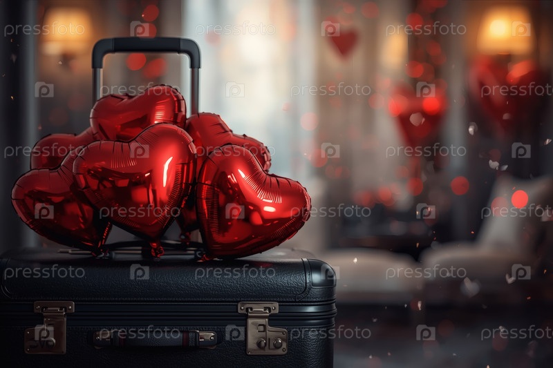 Балонный чемодан в форме сердца в гостиничном номере, чтобы отпраздновать День святого Валентина.Романтический праздник для двух любовников, действие 14 февраля