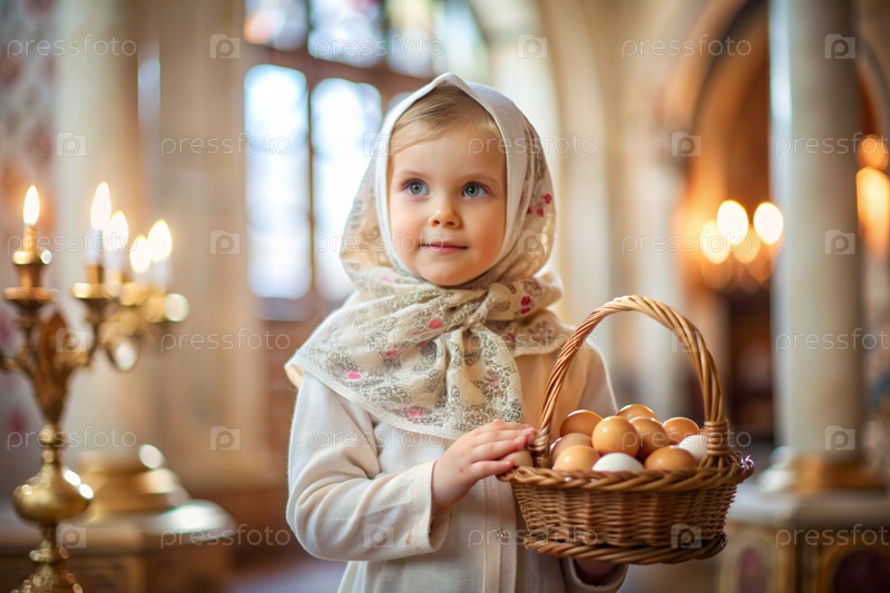 Счастливая Пасха. Христианство. Портрет трехлетней девочки в русском народном платье и шалах с корзиной из плети с пасхальными яйцами в руках на фоне православной церкви