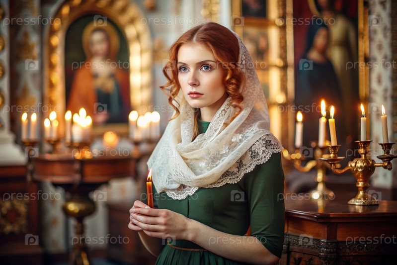 Портрет красивой молодой женщины с платками в православной церкви.Девушка молится в церкви среди икон