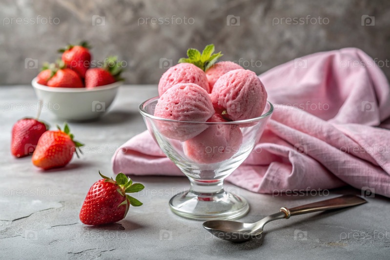 сладкий десерт. любовь к мороженому. клубничные шарики с мороженым в стеклянной таре и свежие ягоды. баннер, реклама