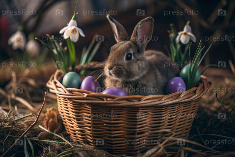 Баннер. пасхальный кролик в корзине из красочных пасхальных яиц вокруг весенних снегопадов и первичной розы. концепция праздника Пасхи