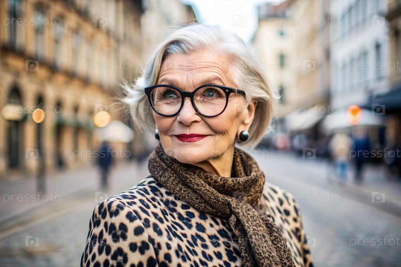 Портрет стильной, модной пожилой женщины, пенсионерки 70 лет на улице города в очках и одежде леопарда