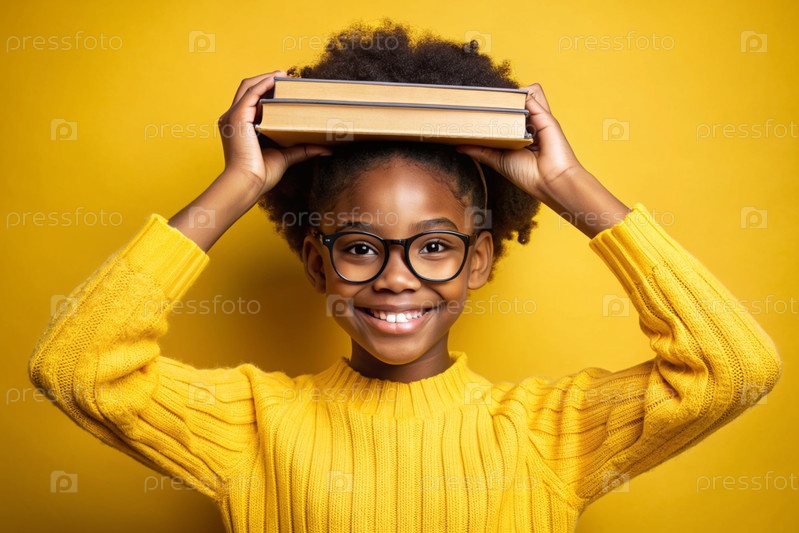 Красивая афроамериканская девушка с очками и книгами. Ребенок впервые ходит в школу. Ребёнок на желтом монохромном фоне