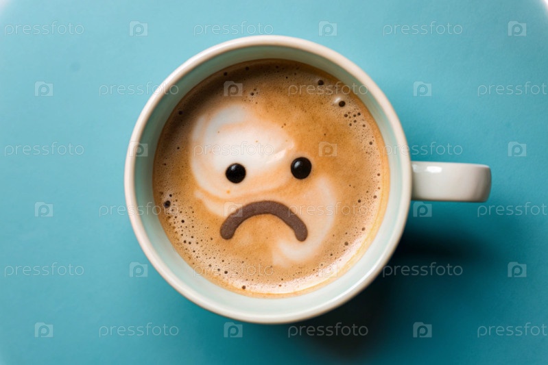 Чашка кофе с грустным улыбающимся лицом на пену на синем столе