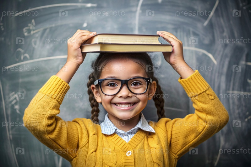 Красивая девушка с очками и книгами на голове. Ребенок впервые идет в школу. Ребёнок в классе со доской на заднем плане. Возвращение к школе