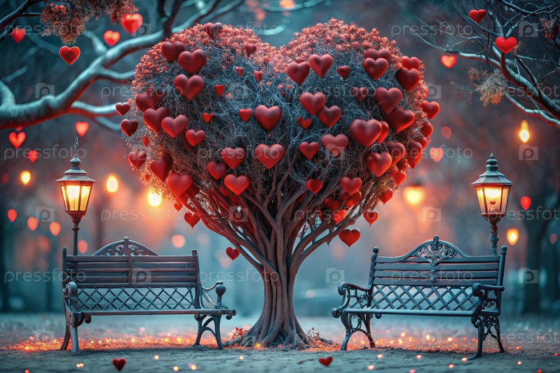 Красивое фантастическое дерево в форме сердца, сияющее среди деревьев парка и скамейка для влюбленных на сказочном фоне боке-стиля