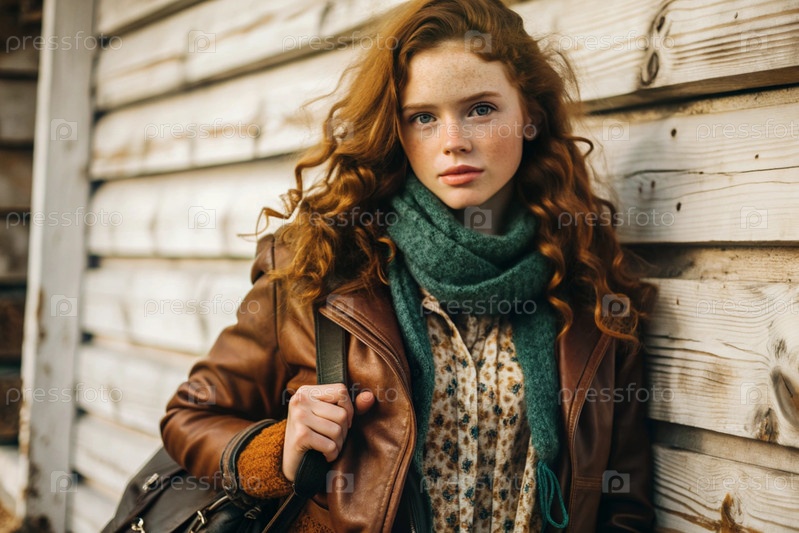 Осенний портрет. Близкий план молодой рыжеволосой женщины с выразительными зелеными глазами в коричневом кожаном куртке и бирюзовом шарфе