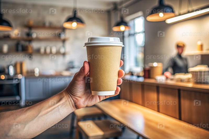 Экологически чистый одноразовый бумажный стакан с кофе на столе в руках бариста на размытом фоне кофейни
