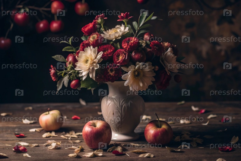 Красочное лето, осенний букет цветов различных красных, розовых, белых оттенков в вазе и спелые красные яблоки на столе