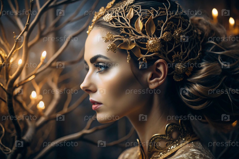 Творческий баннер для салона красоты в черно-золотом цвете. Красивая женщина, окруженная лесом с макияжем и волосами. Золотые ветви дерева в волосах. Индустрия красоты