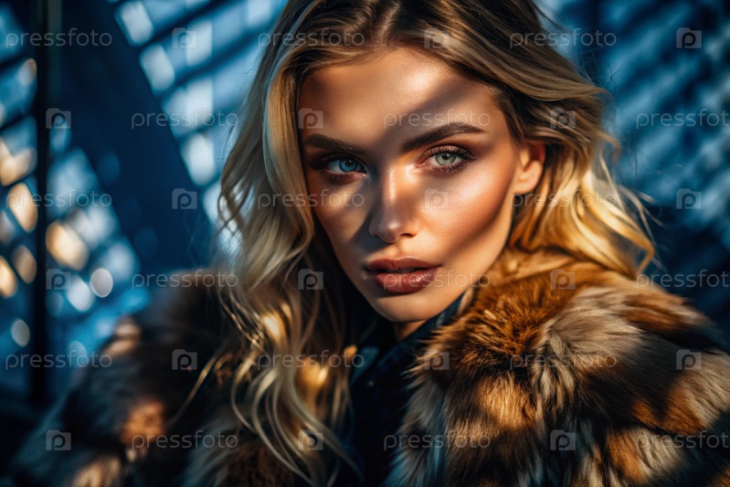 Красивый портрет российской модели в мехах на нейтральном синем фоне с контрастным освещением и тенями
