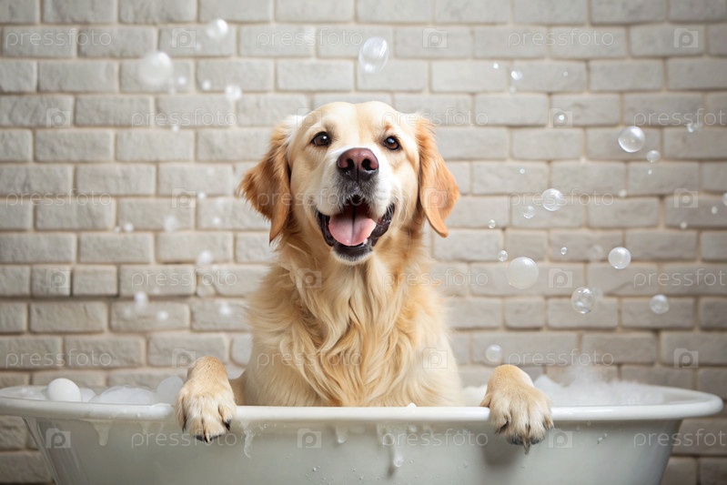Золотой ретривер купается в пузырьковой ванне. Помыть собаку. Концепция ухода за домашними животными
