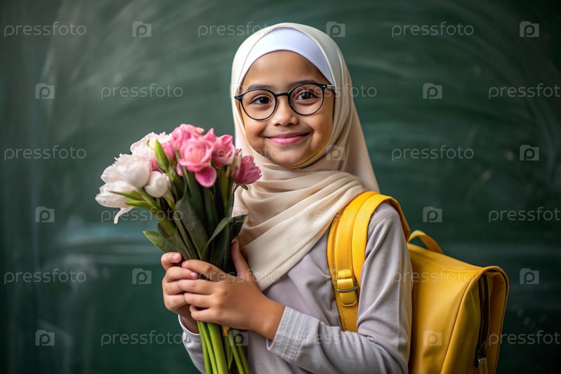 Первоклассник-мусульманин с очками на доске. Девушка держит цветы в руках. Ребенок пойдет в школу впервые. Ребёнок с рюкзаком, книгой и цветами. Возвращение к школе