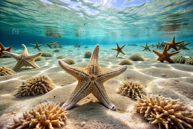 Концепция летних каникул. Подводный мир. Кораллы и морские звезды под водой. Красивый абстрактный фон для баннера
