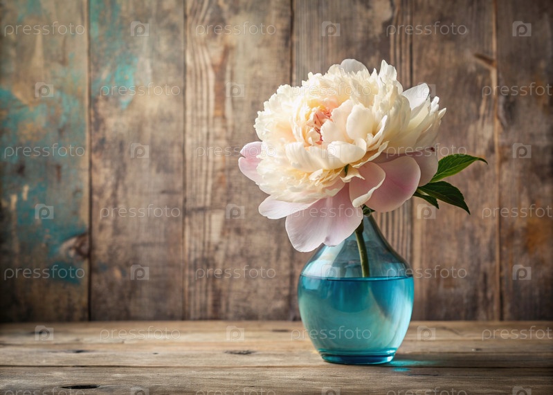 Красивые бело-розовые пионы в стеклянных вазах и бутылки на деревянном шкафчике. Цветы и почки в вазе. Светлый, белый, розовый и синий цветочный фон