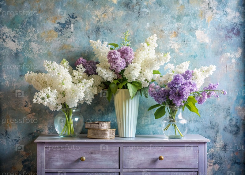 Красивые белые и фиолетовые лиловые цветы в стеклянных вазах и бутылках на деревянном шкафу. Букет цветов в вазе. Светлый, белый, розовый и синий цветочный фон