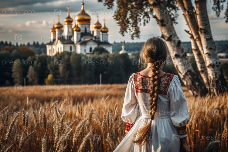 Девушка в традиционном русском льняном наряде и с сковородой на голове на поле спелой золотистой пшеницы на фоне березы и православной церкви