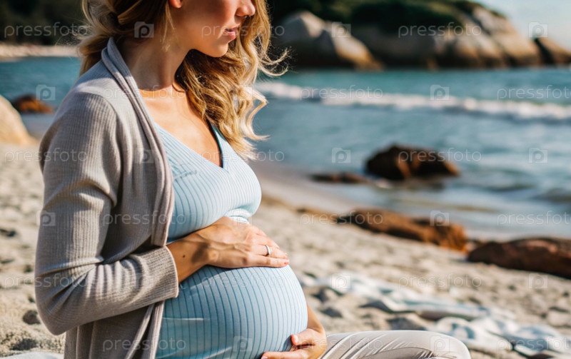 Расслабление, спокойствие, морской воздух. Закрытие живота. Беременная женщина на пляже у моря. Концепция беременности, родов и родительских обязанностей
