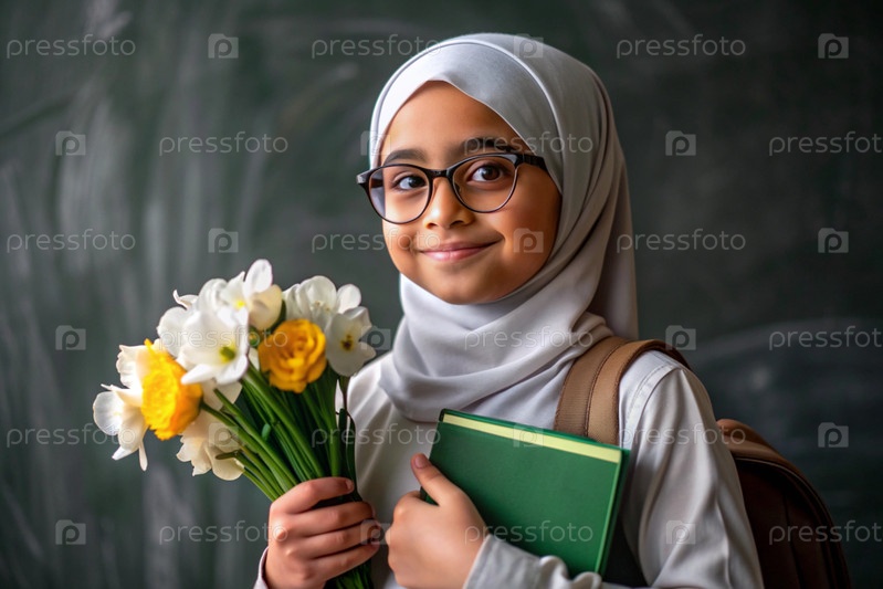 Первоклассник-мусульманин с очками на доске. Девушка держит цветы в руках. Ребенок пойдет в школу впервые. Ребёнок с рюкзаком, книгой и цветами. Возвращение к школе