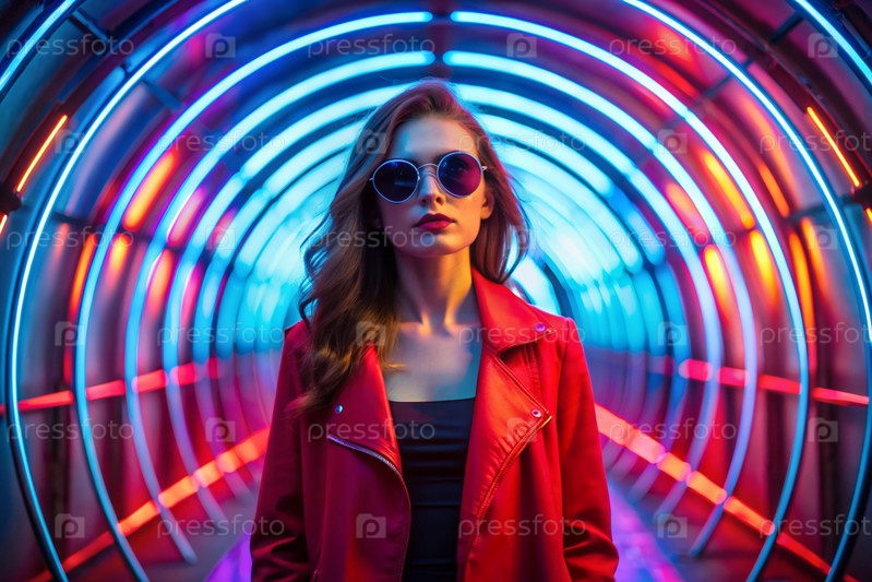 Молодая стильная красивая девушка в солнцезащитных очках стоит в неонном туннеле среди неоновых вывесок