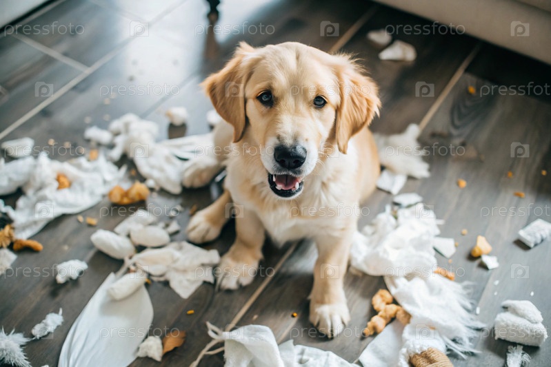 Виновный смешной щенок, ретривер-собака, разбитая комната, порванные игрушки, подушки и бумага, бардак в гостиной