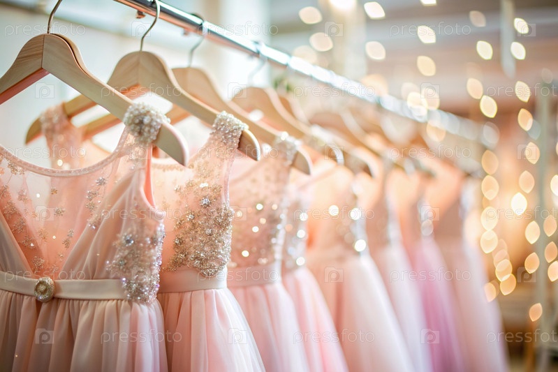 Детские вечерние пушистые светло-розовые платья висят с белых вешалок на палочке в салоне