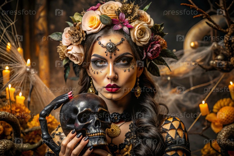 Концепция Хэллоуина. Ужасно. Костюмированная вечеринка. Красивая женщина с покрашенным черепом на лице и цветами на голове. Баннер, открытка