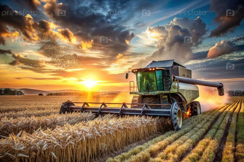 Сельскохозяйственная промышленность и машиностроение. комбинированный комбайн удаляет золотые колоски спелой пшеницы на фоне созревающего поля. Концепция посадки и сбора урожая богатый урожай