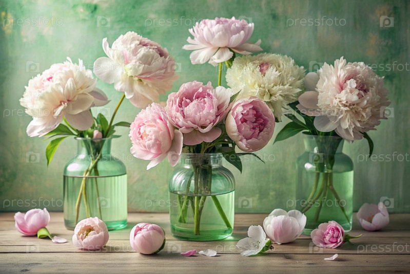 Красивые белые и розовые пионы в стеклянных вазах на деревянном столе. Цветы и почки в вазе. Светлый, белый, розово-зеленый цветочный фон